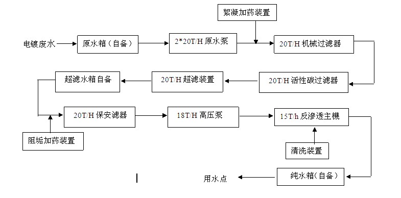 廢水→原水箱(自備)→原水泵→(絮凝加藥裝置)石英砂過濾器→活性炭過濾器→超濾裝置→超濾水箱自備→(阻垢加藥裝置)保安濾器→高壓泵→反滲透主機(清洗裝置)→純水箱自備→用水點