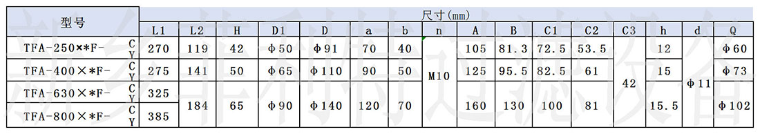 (五)、安裝尺寸 1、管式(出油口螺紋連接) 2、法蘭式(出油口法蘭連接) 表一、TFA-25~160螺紋式連接尺寸 表二、TFA-250~800法蘭式連接尺寸