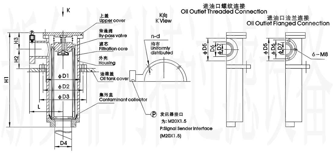 1. 過濾器直接安裝在油箱蓋板上,筒體伸入油箱的油液中。進(jìn)油口設(shè)有螺紋好法蘭連接方式,與回油管路連接,管路簡單,安裝方便。