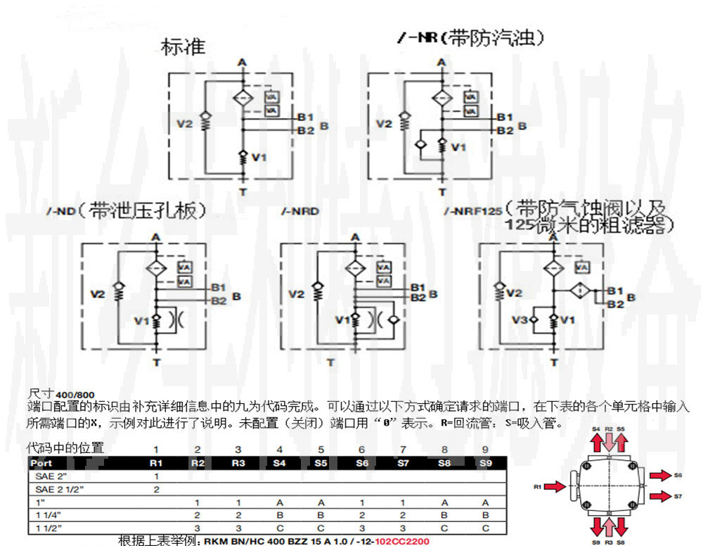 •裝有旁通閥V2(標(biāo)準(zhǔn)=36 psi)用于泄壓濾芯中的背壓過大(對于冷啟動很重要)。來自油箱的流量可通過防氣蝕閥引至吸入側(cè)短時(緊急功能)。