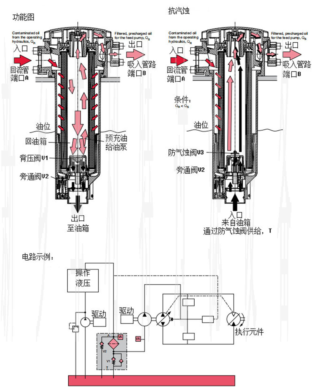 •工作液壓裝置的回流管流被輸送至通過端口A(入口)進(jìn)行過濾,并由濾芯(全流量)進(jìn)行清潔回流管過濾)。壓力(標(biāo)準(zhǔn)=7psi)由背壓閥V1。這確保過濾、預(yù)充電回流管流量可通過端口B(全流量吸入增壓過濾)。多余的液體通過至油箱的背壓閥(端口T)。